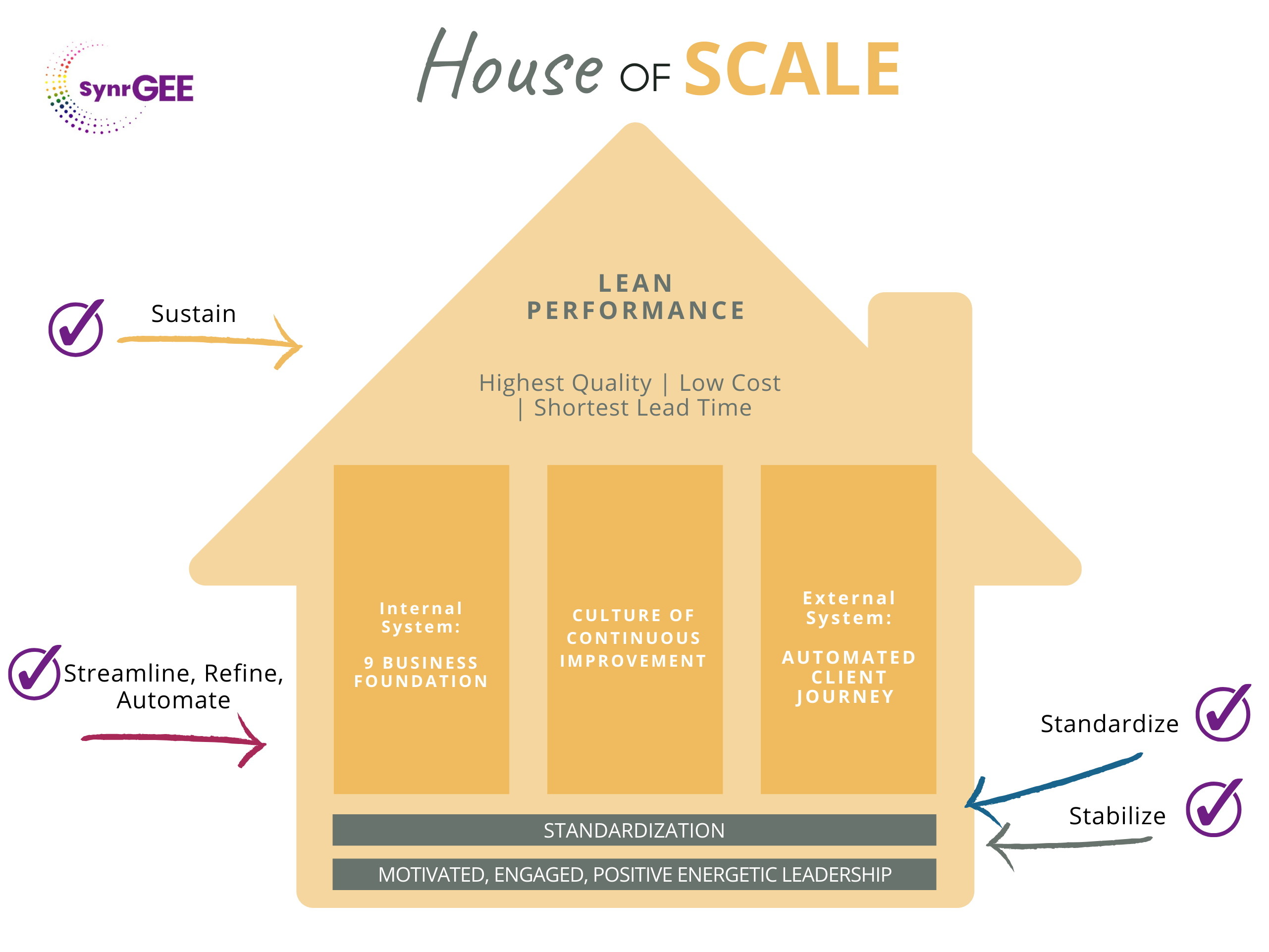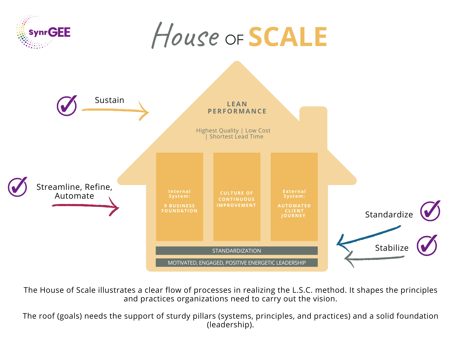 The House of Scale illustrates a clear flow of processes in realizing the L.S.C. method. It shapes the principles and practices organizations need to carry out the vision.